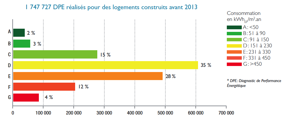 Le DPE offre d’ailleurs une photographie précise du parc actuel. Sur les quelque 2 millions de DPE absorbés par l’Observatoire DPE de l’Ademe avant la fin 2015, près de 280 000 logements (16 %) affichaient une consommation supérieure à 330 kWh/m2/an, et devront par ailleurs être rénovés avant 2025. D’ordre général, 63 % des bâtiments construits avant 2013 se situaient dans les classes D et E, consommant ainsi entre 151 et 330 kWh/m2/an. « La moyenne actuelle du parc immobilier français se situe autour de 180 kWh/m²/an ce qui équivaut à la classe D de l’étiquette énergie », selon le rapport.